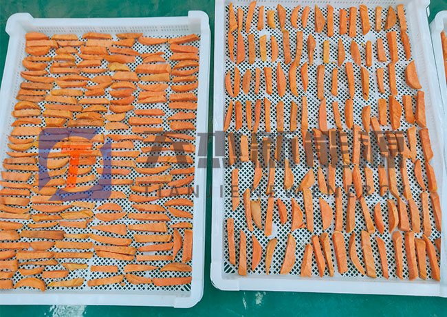 紅薯烘干工藝:紅薯烘干加工前需要先將紅薯去皮清洗,然后蒸煮。在有七八分熟的時候將其取出,冷卻,切片或切條、切丁。在切片環(huán)節(jié)中,要保持厚度一致差別別太大,將切好的紅薯均勻整齊的擺放在烘盤上。然后進行烘干。紅薯烘干機需要多久?請看下面介紹。