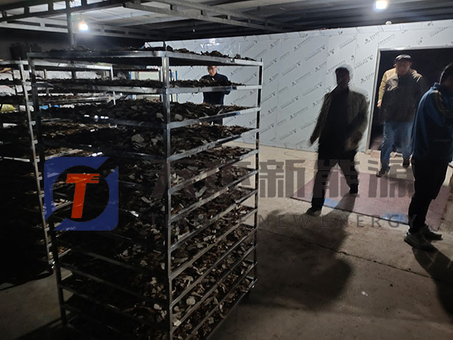 四、在前面的基礎(chǔ)上繼續(xù)升溫10℃,將溫度參數(shù)設(shè)置在50-60℃的范圍,隨著溫度繼續(xù)升高,山藥處于中溫中濕的狀態(tài),這時(shí)持續(xù)的溫度和循環(huán)風(fēng)將熱量均勻的送到烘干機(jī)間的各個(gè)角落,山藥持續(xù)蒸發(fā)出水汽并被排濕系統(tǒng)帶走。