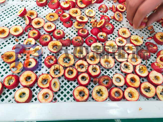 二、接下來就是進(jìn)行護(hù)色處理,一般多用0.5%異維生素C溶液浸泡10-15分鐘,防止果片變色并盡快瀝干水分,均勻的將山楂片平鋪向托盤中,隨后放進(jìn)烘干機里。