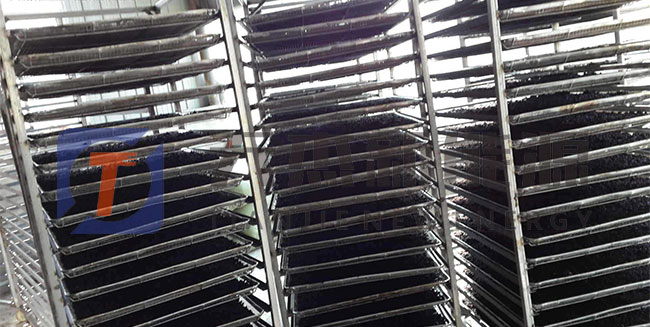 1)桑葚裝盤:使用桑椹烘干機(jī)烘干處理,時間要18個小時就可以烘干處理完了。一般每4公斤鮮桑葚可制成1公斤桑葚干。將經(jīng)整理去雜后的桑葚裝入托盤,送進(jìn)物料車內(nèi)。每臺物料車不宜超過14個托盤,托盤層間距控制在10公分左右。以10P機(jī)為例,不要超過10臺物料車,以保證桑葚烘干機(jī)內(nèi)有合理間隙位,利于熱風(fēng)通過。