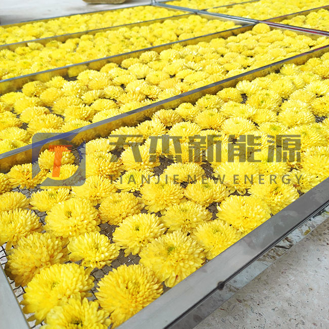 清洗擺盤:將清洗好的菊花稍微瀝干后放置在菊花烘干機設(shè)備托盤上,擺放好位置,再將托盤放到推車上,擺滿一車。推入菊花烘干機內(nèi)。