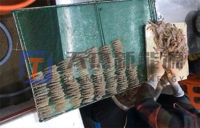 二階段:烘干,蒸制后的蝦均勻放在網盤上,放入魚蝦烘干房烘干,烘干溫度約50到65度,約3到4個小時,相對濕度控制在18%左右即可。