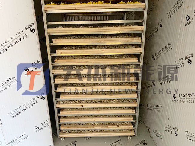 將挑選好的金絲皇菊均勻的鋪在烘盤中推入信陽(yáng)金絲皇菊烘干機(jī)內(nèi)準(zhǔn)備烘干