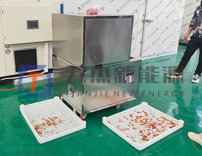 2、護(hù)色處理,一般多用0.5%異維生素C溶液浸泡10-15分鐘,防止果片變色并盡快瀝干水分,均勻放入山楂烘干機(jī)設(shè)備物料車內(nèi),注意平鋪厚度不宜過厚。