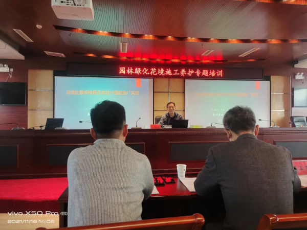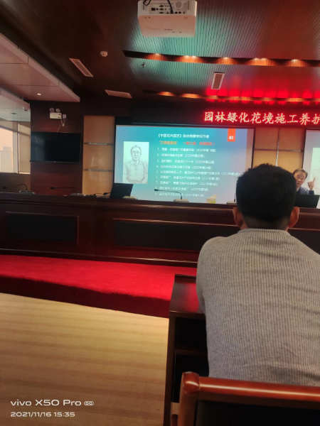 2021年11月16日,泰州市泰元園林建設(shè)有限公司項(xiàng)目經(jīng)理虞九東在泰州市住房和城鄉(xiāng)建設(shè)局參加成海鐘教授關(guān)于園林綠化花鏡施工養(yǎng)護(hù)專題培訓(xùn)